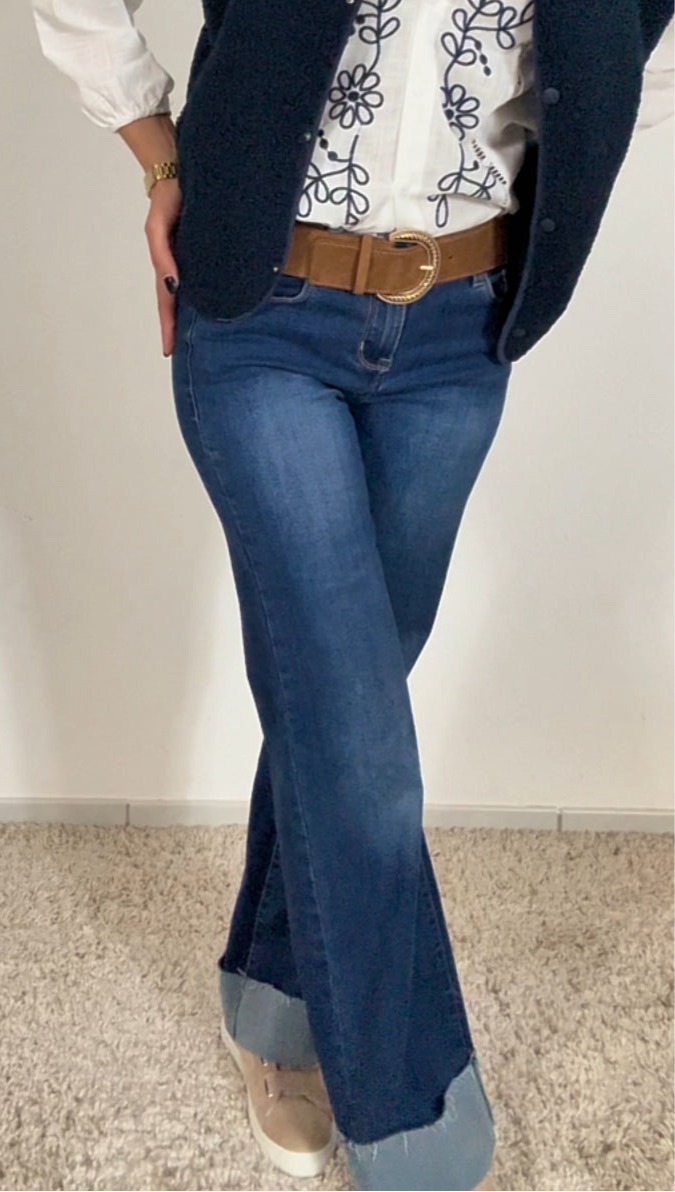Jean FLARE, (coupe vintage, légèrement ajusté du haut de la cuisse puis droite sur le reste de la jambe) avec un grand revers. Possibilité de réajuster le revers (2 points seulement). Stretch, très confortable.