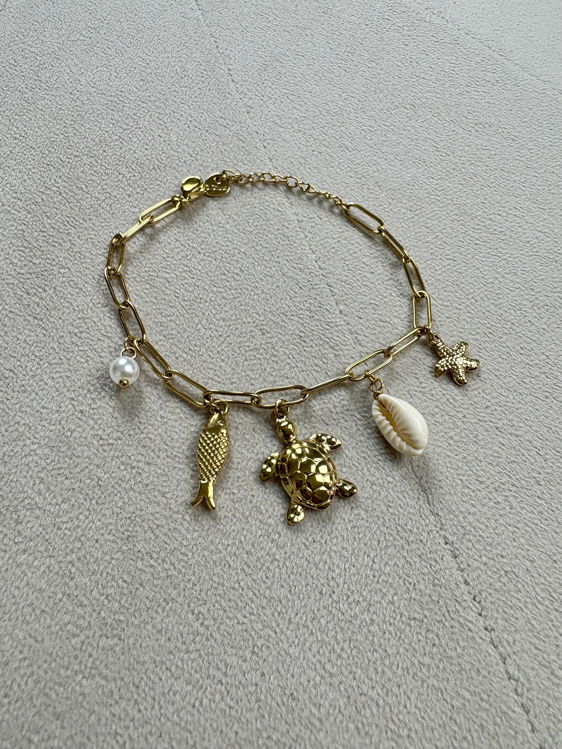 - Bracelet estival à breloques ( coquillages, perles blanches, tortue, poisson)