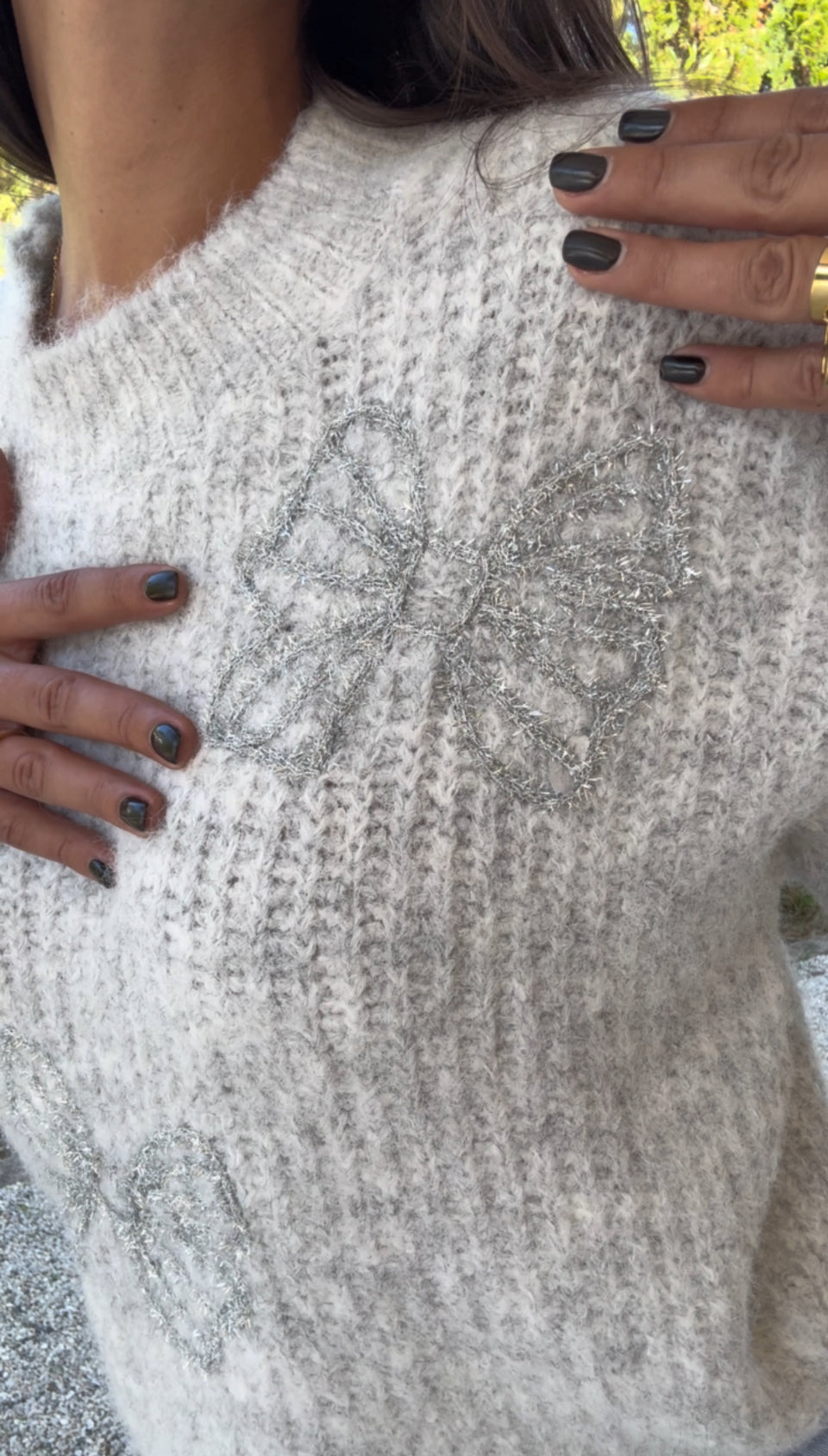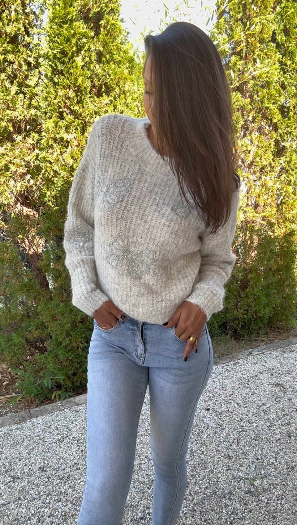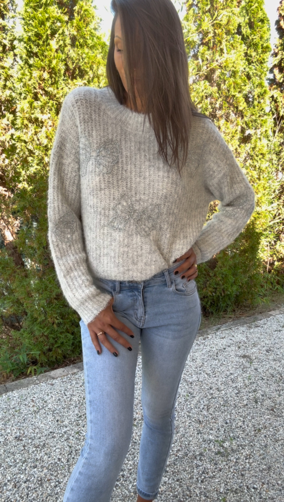 Pull aspect mohair, broderie en forme de "nœuds" argentés.